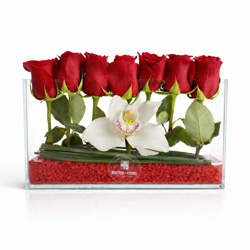 💞 Love is all about a meaningful connection. Celebrate romance with this elegant floral arrangement, featuring classic red roses and pristine white Phalaenopsis orchids, artfully arranged in a sleek rectangular glass container. Perfect for Valentine’s Day, anniversaries, or any romantic occasion, this bouquet is a timeless expression of love.