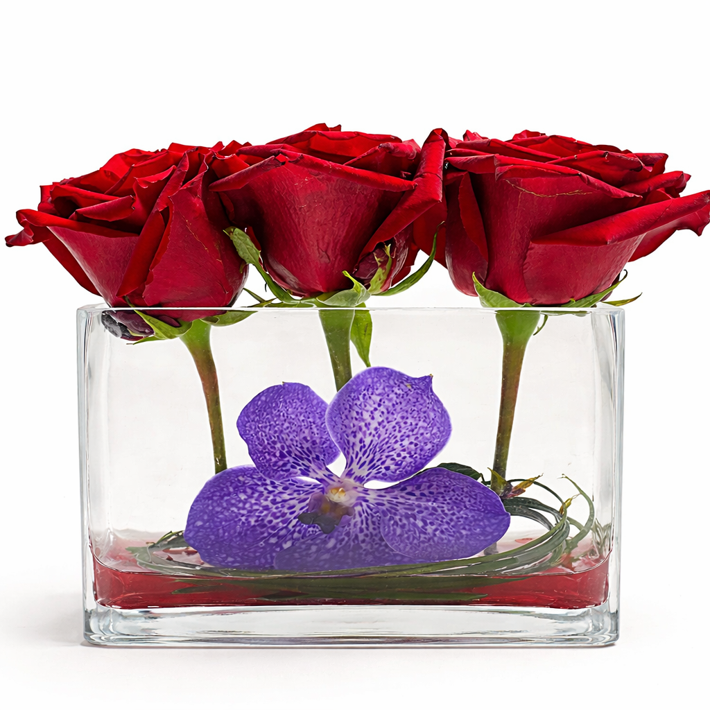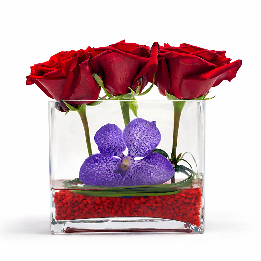 Make a bold statement with this stunning floral design, featuring luxurious red roses carefully arranged in a sleek rectangular container, accented with red gravel and artistic steel grass ribbons. A graceful Phalaenopsis orchid adds the perfect finishing touch, creating an arrangement that embodies passion and sophistication.