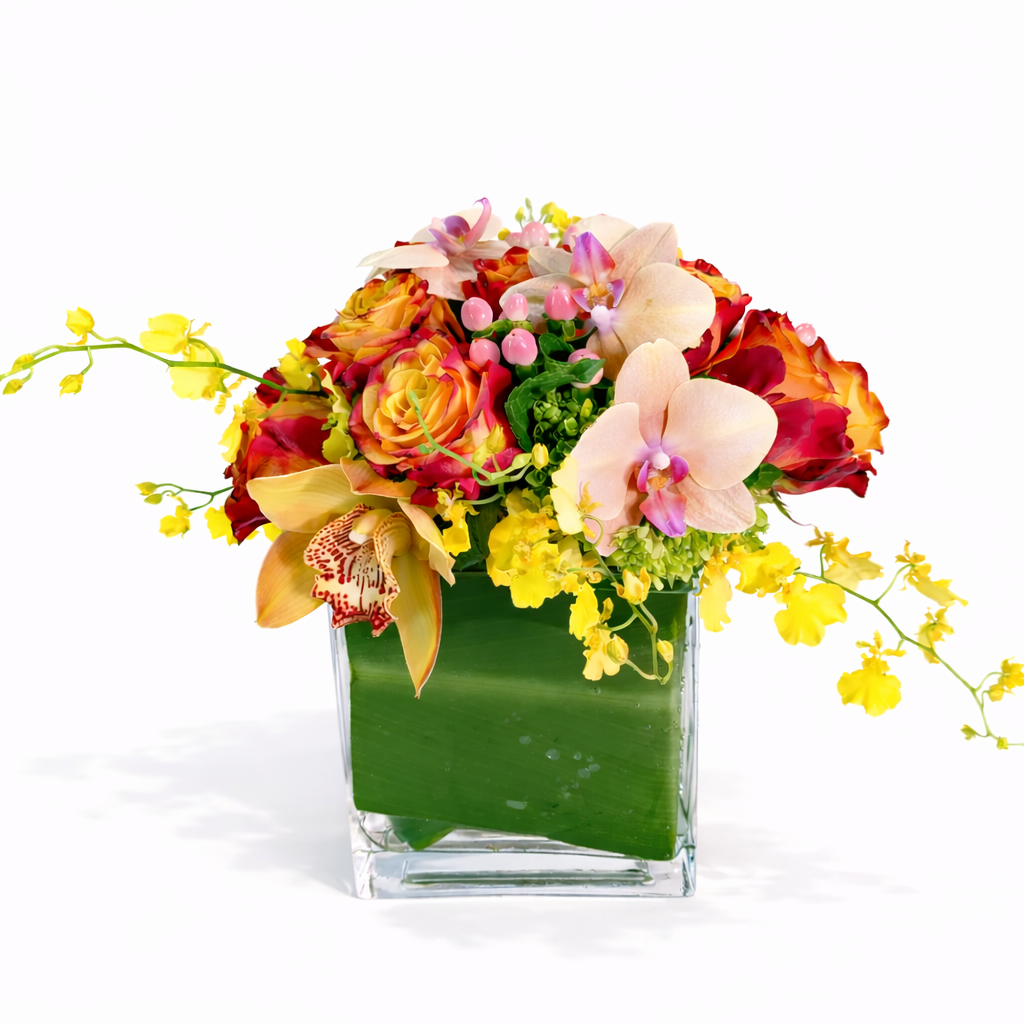 The Warm Ember Arrangement radiates the cozy essence of a crackling fire on a crisp fall evening. This luxurious design combines rich, smoldering tones of Golder Treasure: Phalaenopsis Orchid, Oncidium Orchid, golden orange roses, yellow Cymbidium, and Hypericum Flowers.